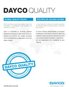 En DFL tenemos el orgullo de trabajar junto a Dayco, una empresa que desde hace más de 115 años se ha consolidado como uno de los fabricantes más importantes de sistemas de transmisión de potencia y componentes automotrices a nivel mundial. DFL es importador Dayco hace más de 40 años y ha desarrollado una amplia oferta de Repuestos Dayco Colombia, destacándose en la distribución de correas y otros productos para el mercado automotriz colombiano.